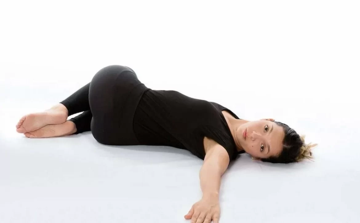 شاید عجیب باشد، اما کوتاهی عضلات جلوی ران باعث چرخش لگن به سمت جلو و افزایش قوس کمر میشود که به صورت مستقیم عصب سیاتیک را تحت فشار قرار میدهد. به منظور انجام این تمرین، ابتدا به پهلو دراز بکشید، پای بالایی را از زانو خم کنید و مچ پا را با دست بگیرید و به سمت باسن بکشید. با صاف کردن وضعیت لگن از طریق این کشش، توازن عضلانی بین جلو و پشت بدن برقرار شده و بار اضافی از روی مهرههای کمری برداشته میشود.